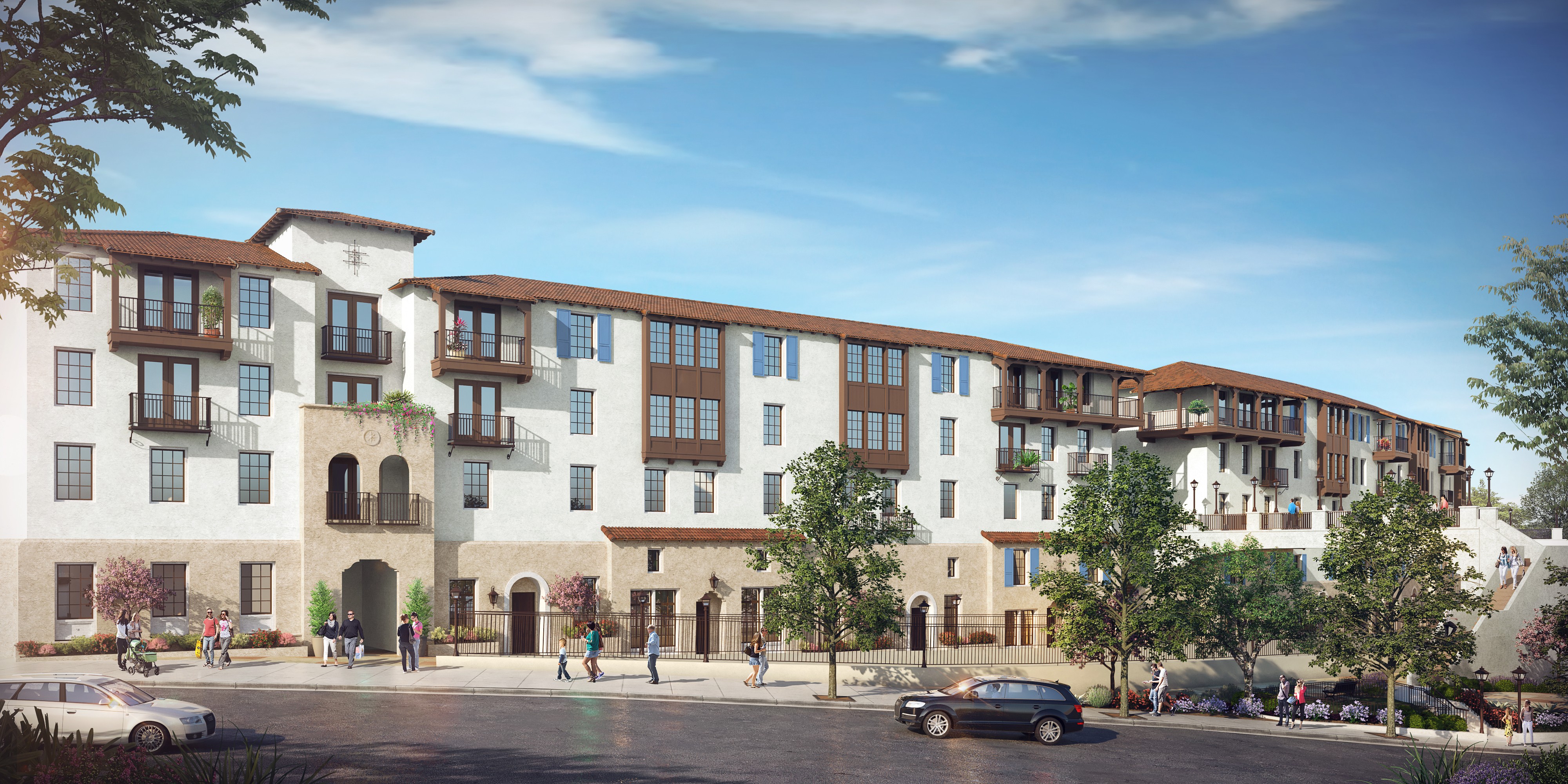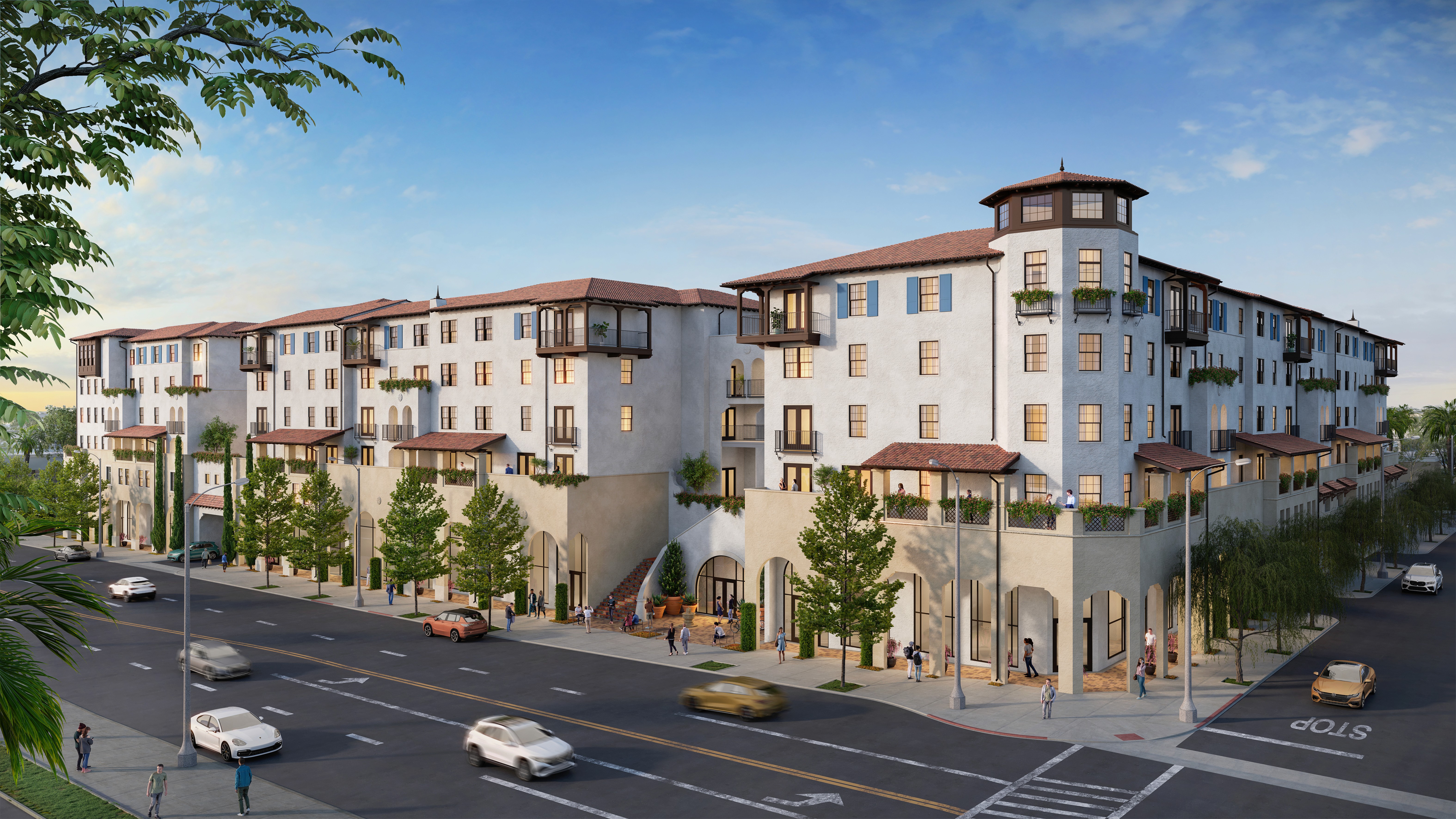 Building 2: Four-story mid-rise with 16 condominium units and first-floor retail, continuing the Spanish Colonial design language for a cohesive streetscape.